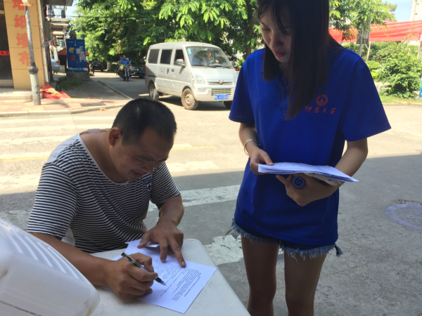 当天上午,实践队分成三个小组,向当地居民分发调查问卷。在调查过程中,队员耐心向居民讲解留守儿童的有关问题,对居民提出的问题进行解答,并倡导大家一起关爱留守儿童。同时,队员们还让"爱邻舍"的负责人对本次问卷调查提出一些建议与看法。此外,实践队对问卷的结果进行统计分析,并得出相关结论。