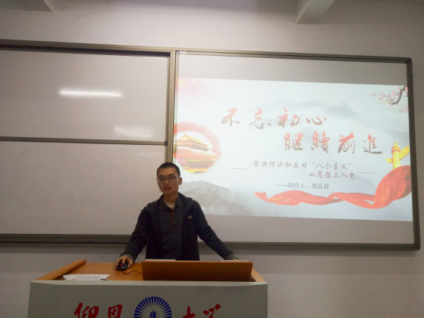 此次学习会以“反对‘八个主义’,端正思想态度”为主题,大学生党员要学做合一,永葆共产党人本色。会上,高辰铎、杨雪淋等同志分别从“坚决反对八个主义,从思想上入党”和“我为什么要入党”等方面入手,讲述了作为大学生党员要弘扬忠诚老实、公道正派、实事求是、清正廉洁等价值观,坚决防止和反对“八个主义”以及坚决反对搞两面派、做两面人。