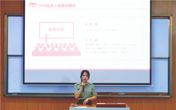 在宣讲会中,校征兵宣讲团宣讲人丘晟祯围绕“征兵入伍条件要求”“政策解读”“参军入伍政治经济待遇”“学校的相关政策”等方面进行宣讲,让同学们进一步明确当兵入伍基本条件、相关流程以及当兵的益处。期间,2018级法学2班退伍军人陈景仕以PPT、视频的形式,为在场的师生分享他的军旅生活,了解部队的真实生活。