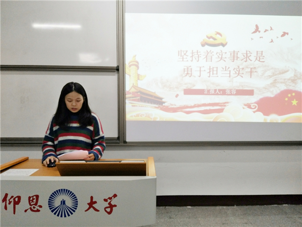 此次学习会以“坚持实事求是,勇于担当实干”为主题,强调了身为一名党员要脚踏实地、真抓实干,善于解决问题,努力创造经得起实践、人民和历史检验的实绩。会上,张容、黄宏等同志分别从“何为实事求是”和“作为学生党员如何做到担当实干”等方面入手,讲述了作为新时代党员必须坚持实事求是,勇于担当负责,积极主动作为,保持斗争精神,以坚韧不拔的意志和无私无畏的勇气战胜前进道路上的一切艰难险阻。