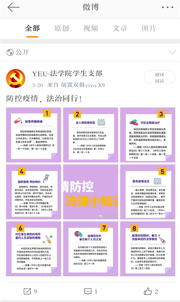 活动前期,学生党支部根据疫情防控工作中发生或遇到的违法犯罪问题以及相应涉及到的法律条款制作成海报。活动期间,通过微博、微信、QQ空间等平台,向师生群众科普此类法律知识,引导周围师生群众增强法治意识,依法支持和配合疫情防控工作。