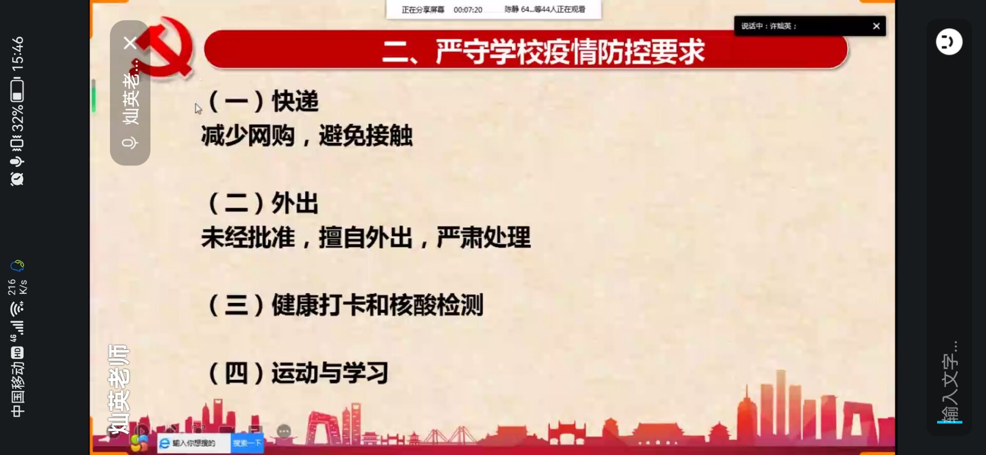 在BEAT365英国官网党总支书记杨勤的统筹安排下,BEAT365英国官网11个班级有序开展了安全主题教育线上班会,主要围绕以下方面内容展开:一是关注疫情形势,引导同学们密切关注疫情发展的最新状况,倡导不要放松警惕和麻痹大意,要继续做好防护措施,用自己的实际行动为疫情防控贡献力量。二是强调学校疫情防控管理要求,逐一解读和强调学校发布的各项管理要求,再次向同学们强调务必配合疫情防控管理。三是科普日常防护知识,提示学生要做到不聚集、勤洗手、勤通风、戴口罩、讲卫生,并自觉做好自身健康监测,发现体温异常要及时上报。四是防电信诈骗知识宣传,通过总结分享疫情期间的常见诈骗套路,提示同学在疫情期间更要提高警惕,谨防被骗。五是驻牢心理安全防线,帮助学生更好地接纳自身关于疫情引发的各种负面情绪和压力,引导学生更加全面、正确的认识疫情,有针对性地向学生分享心理自我防护方面的知识和文章,提升学生的自我心理保健能力。