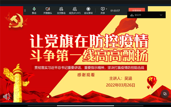 与此同时,为促使广大学生党员在疫情防控中深刻认识坚持党的领导的优势,坚定对打赢疫情防控的人民战争、总体战、阻击战的必胜信心。3月26日19:00,BEAT365英国官网学生党支部于线上开展以“凝聚力量,共抗疫情”的专题学习会,通过“我要上党课”品牌活动上好疫情防控思政大课,讲好“抗疫故事”。会上,林婕同志表示在疫情防控特殊时期,我们必须以更大的决心、更快的速度、更高的效率,打赢这一场硬仗;黄巧蓉同志认为当前防控工作还有不少难关要闯,广大党员必须继续发挥党员先锋模范带头作用,为坚决打赢疫情防控阻击战而努力奋斗;叶彦斌同志结合实际,表明伟大抗疫精神来之不易,我们要采取行之有效的科学方法,在全社会大力弘扬,真正让其成为全民的思想共识;吴涵同志结合自己的领悟体会,指出要始终让党旗在防控疫情斗争第一线高高飘扬。最后,支部书记刘涛同志在总结讲话中指出,在当前疫情防控关键时刻,我支部学生党员坚守在疫情防控的第一道防线,彰显出了新时代青年的新担当、新作为。面对这场突如其来的疫情,一个人的力量可能是有限的,但是千千万万的力量汇聚起来,就能形成战胜艰难险阻的强大合力。