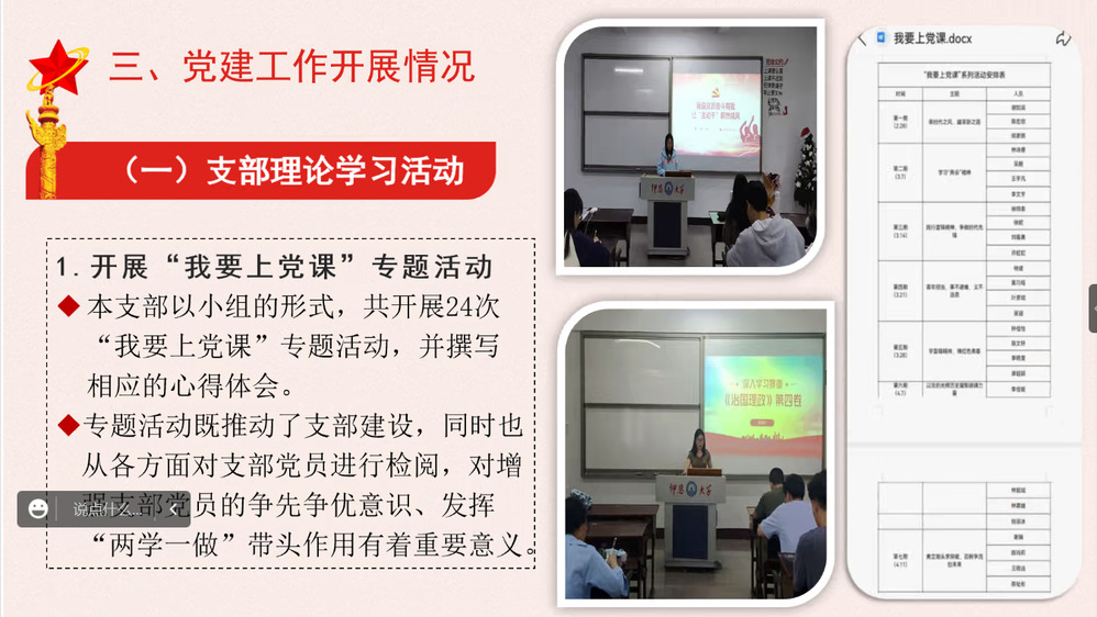 各党支部书记分别就2022年度党建工作履职、支部建设等工作进行了全面总结汇报,深入分析了存在的不足和今后努力的方向。教工支部书记黄文伟从教工支部成员情况及支部组织建设两方面汇报,并表示今后要扎实推进党员教育,创建学习型党组织,以党建推进教学科研工作。学生支部书记吴姗姗从支部基本情况、党建工作内容、党建工作开展情况、党支部建设情况和样板党支部工作方面分别进行汇报,并就存在问题及原因展开探讨,表示今后要加强对发展对象和入党积极分子的理论学习培养,积累学习交流经验,推进支部建设与发展。