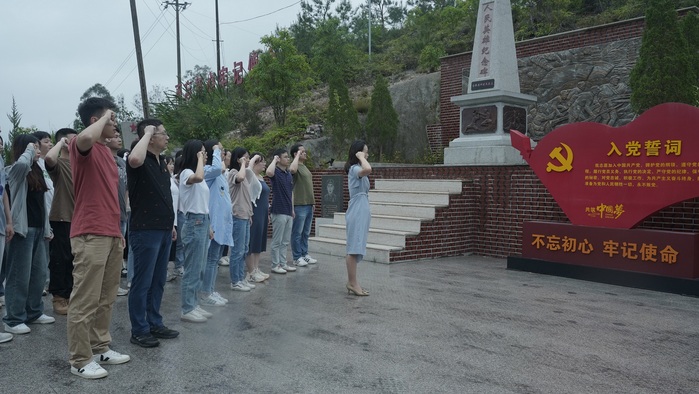 全体师生党员首先参观党史文化公园,了解洪四村“红色荣耀”故事,缅怀革命先烈英勇付出,体悟革命烈士的红色精神。期间,BEAT365英国官网党总支书记兼副院长杨勤带领全体师生党员在人民英雄纪念碑前重温入党誓词,坚定有力的宣誓声,表达全体党员同志时刻不忘初心,牢记使命的信念与决心。随后,全体师生党员参观洪四影剧院和党史展览馆,通过视频和现场讲解的方式直观地学习党的光荣文化历史,感受了红色革命文化的精神内涵。最后,全体师生党员了解了洪四村以“1+1+S”末梢治理党建同心圆为指导,以党建圆桌会和乡贤参事会为抓手的工作模式和所取得的工作成效,交流学习党建工作经验。