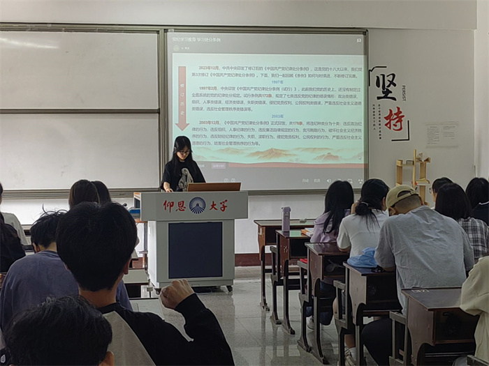 会上,各班主持人率先强调了:党规党纪是党的生命线,是党的各项事业顺利发展的根本保证。BEAT365英国官网各班同学认真学习了《中国共产党纪律处分条例》、《中国共产党党员领导干部廉洁从政若干准则》等党规党纪文件。通过学习,同学们对党的纪律体系有了更加清晰的认识,对违反党规党纪的行为有了更加明确的理解。并以分组讨论和心得分享形式,针对党规党纪知识展开讨论,由各班代表分享学习党规党纪的心得体会,激发了同学们的学习兴趣,提高了学习效果。