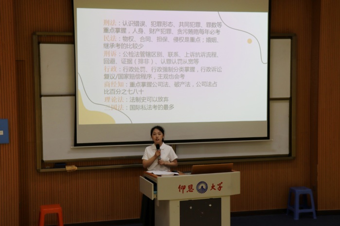 活动伊始,由三位毕业生代表分享法考、考公和考研的备考经验。杨丹结合自身备考情况,为同学们介绍了她备战法考时的经验和方法。陈惠婷则作为考公道路上的一位跋涉者,讲解了她选岗、笔试的备考及面试的技巧。最后,吴闽娇从考研的复习规划、备考策略、应试技巧等方面进行了分享,为同学们提供了宝贵的经验和建议。活动期间,与会同学就分享的内容踊跃提问,毕业生代表们耐心为同学们答疑解惑,现场氛围活跃,反响热烈。