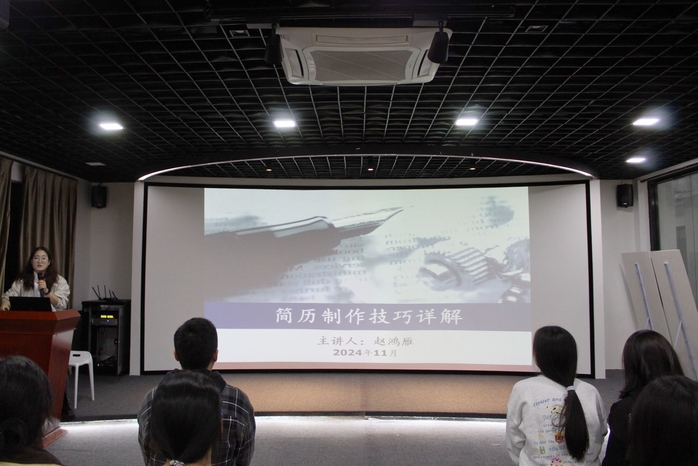 讲座伊始,赵鸿雁老师详细介绍了简历的基本构成。她耐心解析了简历中不可或缺的八个要素,即基本信息、教育背景、实习经历、项目经历、校园经历、技能证书或获奖情况、特长、兴趣爱好及自我评价。此外,赵鸿雁老师还通过展示了大量不同风格的简历案例,通过对比,让同学们清晰地看到一份脱颖而出的简历应具备的特质。创新的排版设计、突出重点的关键词运用以及简洁明了的语言表达都是关键要素。同时也指导同学们如何运用简洁明了的语言描述个人情况、校园经历以及取得的成果等,让招聘者迅速捕捉到求职者的能力与价值。