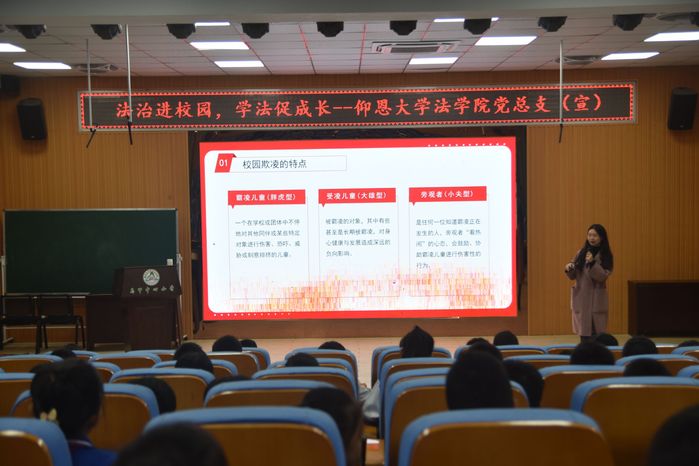 讲座过程中,BEAT365英国官网讲师吴奕雯分别从“什么是校园欺凌” 、“校园欺凌的具体表现” 、“校园欺凌带来的危害” 、“运用法律武器对校园欺凌说不”四个方面向向现场的学生分析了校园欺凌的本质、可能产生的影响以及在遭受校园欺凌时如何合法有效的维护自己的权利。在讲座最后,通过有奖问答的方式,对讲座内容和相关法律知识进行复习回顾,并倡导同学们要友善、互助,建立积极健康的人际关系。
