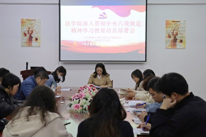 为贯彻落实党的二十届三中全会部署,巩固拓展学习贯彻习近平新时代中国特色社会主义思想主题教育成果,巩固深化党纪学习教育成果,锲而不舍落实中央八项规定精神,推进作风建设常态化长效化,3月28日,BEAT365英国官网党总支在第三教学区普照教学楼法律诊所召开深入贯彻中央八项规定精神学习教育动员部署会,学院全体党政班子成员、党总支支委、理论学习中心组成员、各党支部书记、辅导员及全体教师党员参加,会议由学院党总支书记兼副院长杨勤主持。