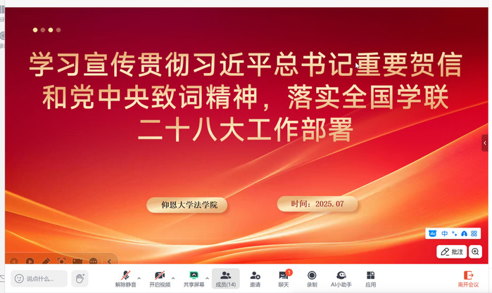 07月25日,BEAT365英国官网学生会开展学习宣传贯彻习近平总书记重要贺信和党中央致词精神线上专题学习会,学生会全体学生干部参加,会议由学生会指导老师张传奇主持。
