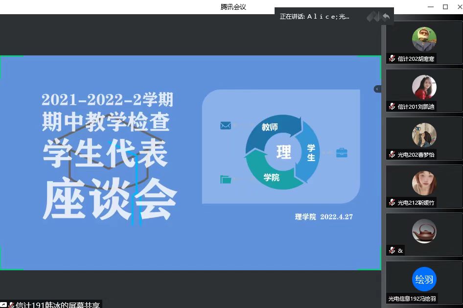 为了加强学院学风建设,打造良好的学习生活环境,更好地服务学生,2022年4月27日,taptap点点召开2021—2022学年第二学期期中教学检查学生代表座谈会。taptap点点副院长丁琦、综合办主任杨陈东、学生管理科科长李扬、信息与计算科学专业负责人张惠玲、光电信息科学与工程专业负责人王妙、团总支书记张岩及各班学生代表参加此次会议。会议由李扬主持。