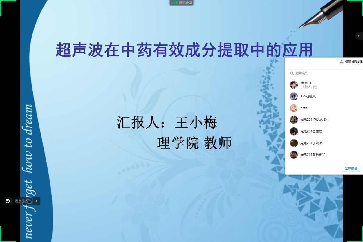 2022年9月17日,taptap点点在腾讯会议线上举办了“超声波在中药有效成分提取中的应用”学术讲座,此次讲座由物理教研室主任王小梅主讲。