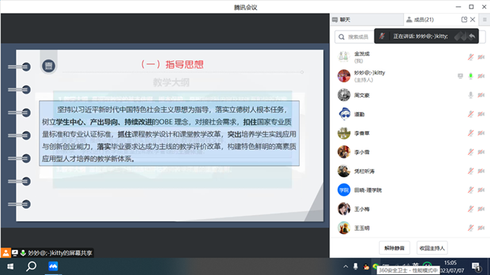 为进一步提高人才培养质量,加强课程思政建设,taptap点点物理教研室于2023年7月7日下午以线上会议方式,召开了2023版光电信息科学与工程专业教学大纲修订与编制研讨会。物理教研室全体成员参加了该会议,会议特邀了学院党总支书记胡红亮和丁琦副院长参加,金发成召集主持。