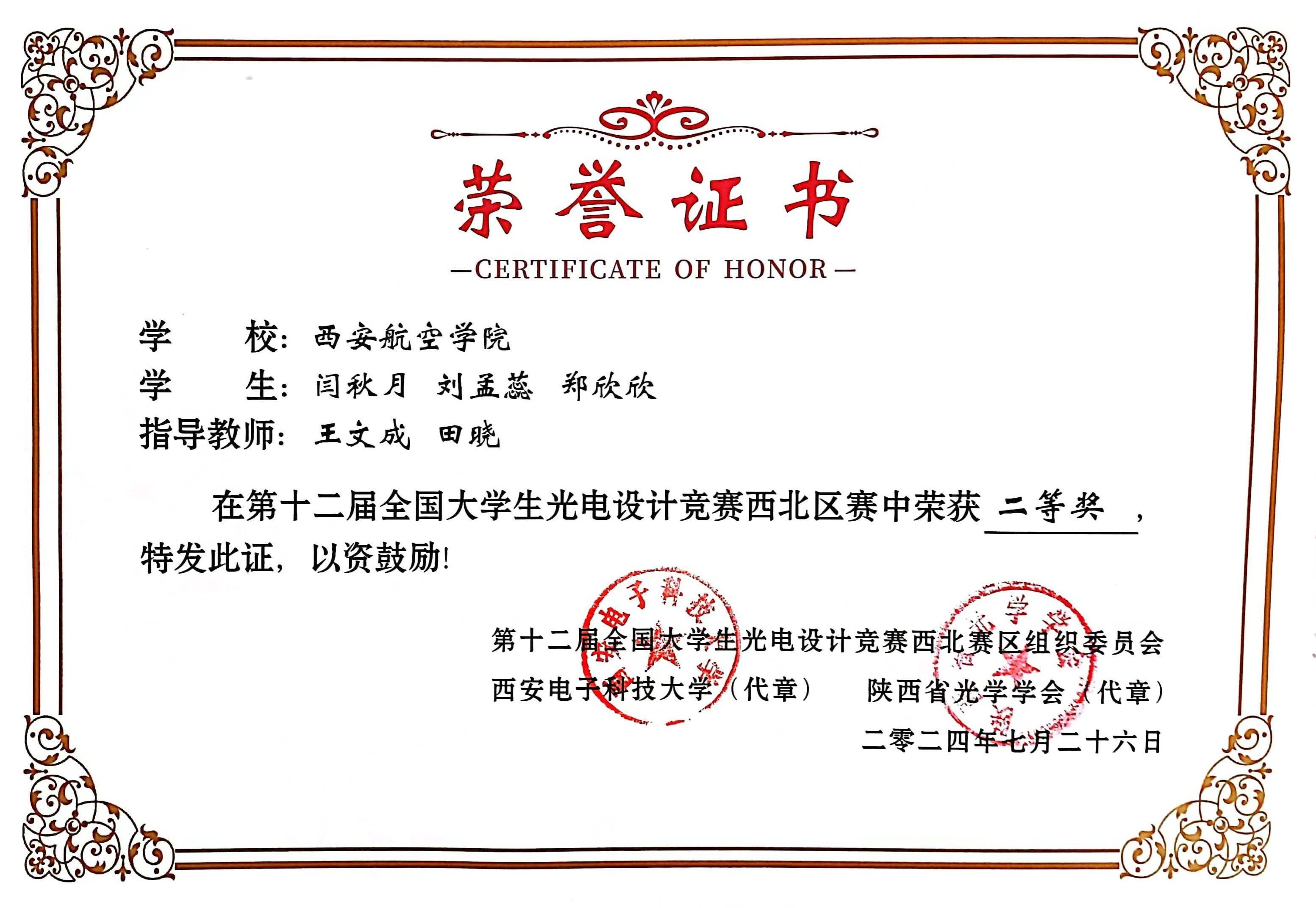 第十二届全国大学生光电设计竞赛(西北赛区)于7-8月在西安电子科技大学隆重举行。本次竞赛以“光电引领、未来可期”为主题,西北地区共有46所高校的524支队伍、1998名师生报名参赛,经过初赛、决赛现场答辩等环节的激烈角逐,学校荣获西北赛区二等奖、三等奖各1项。“全国大学生光电设计竞赛”是由中国光学学会主办、中国光学学会光学教育专业委员会代表主办机构、全国大学生光电设计竞赛委员会具体负责的一项全国高校光电类专业重要的学科竞赛赛事。
