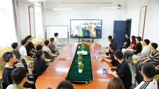 国歌奏响,国旗升起,taptap点点会议室里师生全体起立,屏幕里受阅官兵的步伐铿锵有力,撞击着每个人的心房。英姿飒爽、气势如虹的方阵,现代化武器装备的恢宏阵列,让现场多次爆发出热烈讨论。观看阅兵既是一堂历史课,也是一堂生动的思想政治课和爱国主义教育课。阅兵式结束后,学院组织了座谈交流,大家纷纷表达了自己的观后感。