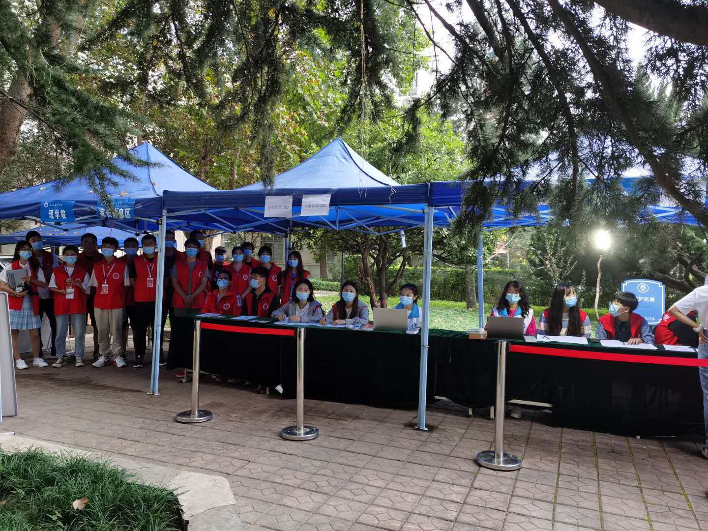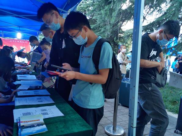 他们有的在门口辛苦地举着院旗接应,有的在接待处耐心地接受家长和新同学的咨询,有的微笑着为学弟学妹办理手续,还有部分同学因场地有限一直默默地坐在台阶上等待着新同学办理完手续便带领他们去往宿舍区。