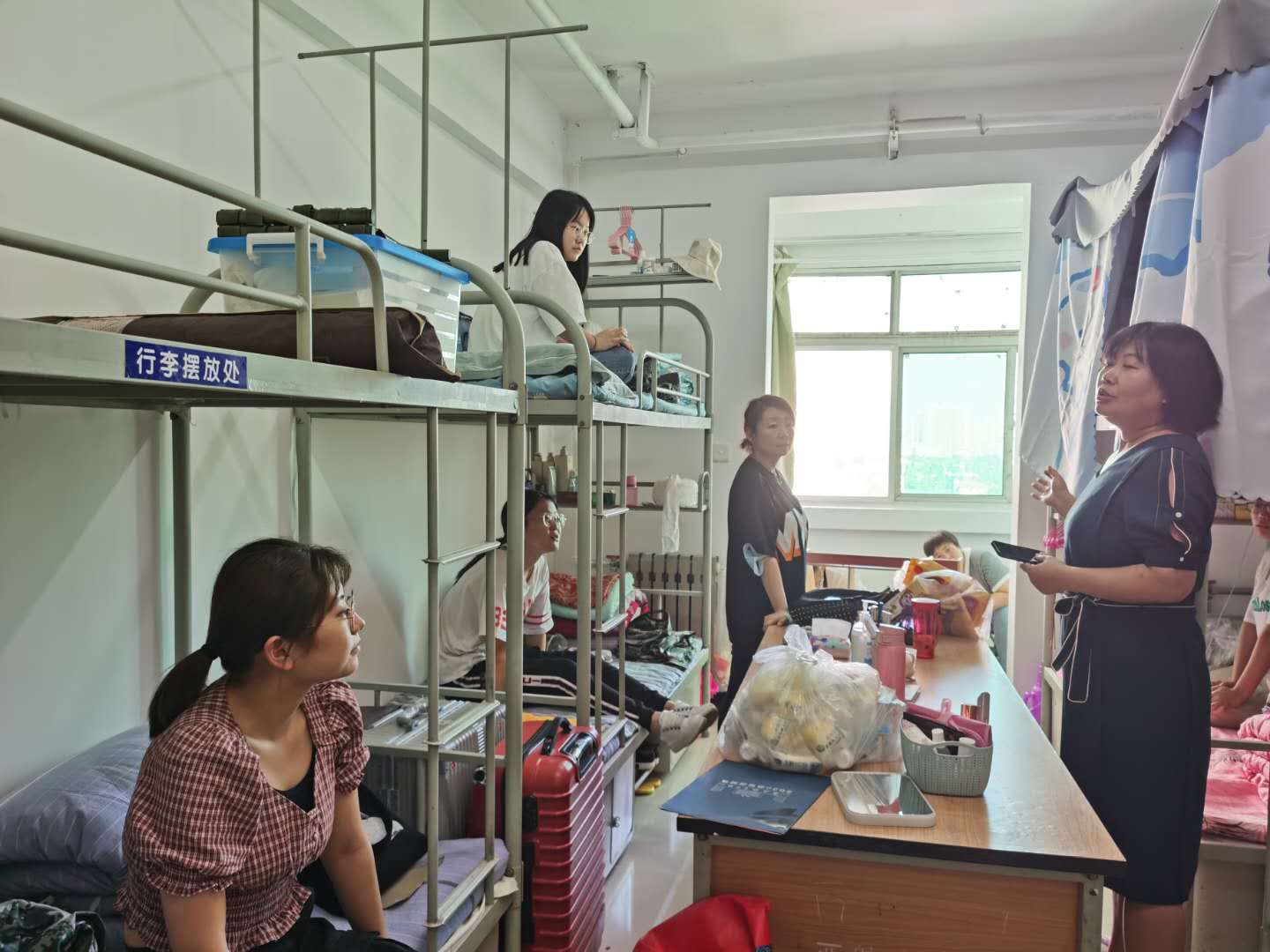 下午3点,李小光和李扬进入宿舍对新生及家长进行慰问,向新生表示欢迎,对学生和家长的一些疑惑进行了解答。