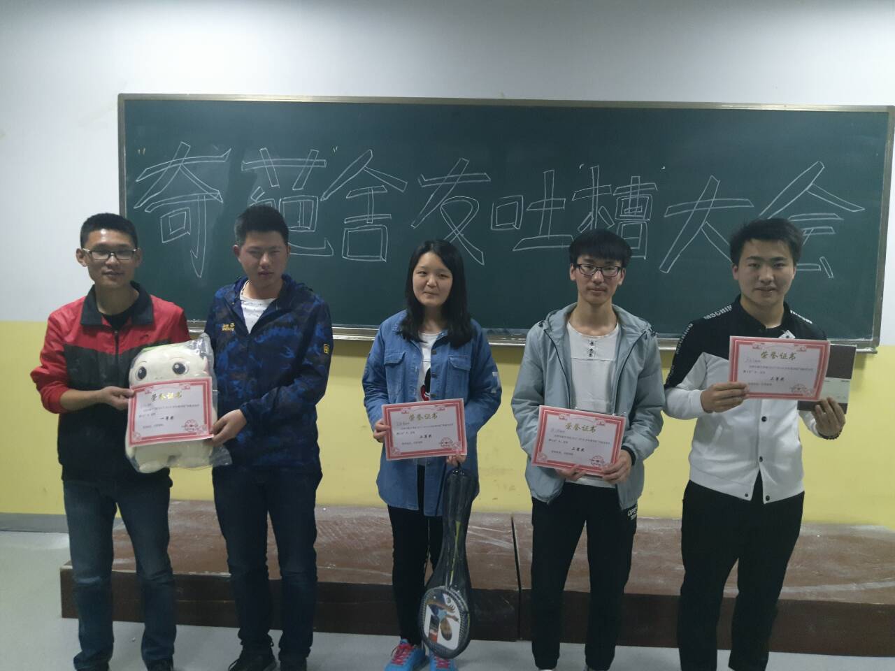 taptap点点团总支书记、辅导员杨陈东,学生分会主席刘亚军,学生分会副主席艾柏宇,团总支副书记秦薇以及大三优秀学生代表曹林超担任评委。活动设置宿舍吐槽,评委点评和颁奖三个环节。首先,选手们依次上台对舍友进行吐槽和自嘲,选手们的幽默风趣引来阵阵掌声和笑声。经过激烈的角逐,李和庆和贾永峰组合获得一等奖,吴青青获得二等奖,杨文超和严东东获得三等奖。