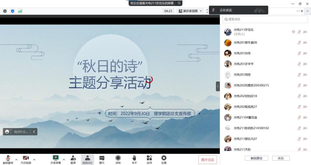 秋天,是美丽的,是香甜的,是硕果累累的,为丰富疫情常态化形势下学生校园文化生活,2022年9月30日,taptap点点于线上举办了“秋日的诗”线上诗歌接力分享活动,大一、大二、大三学生参加。