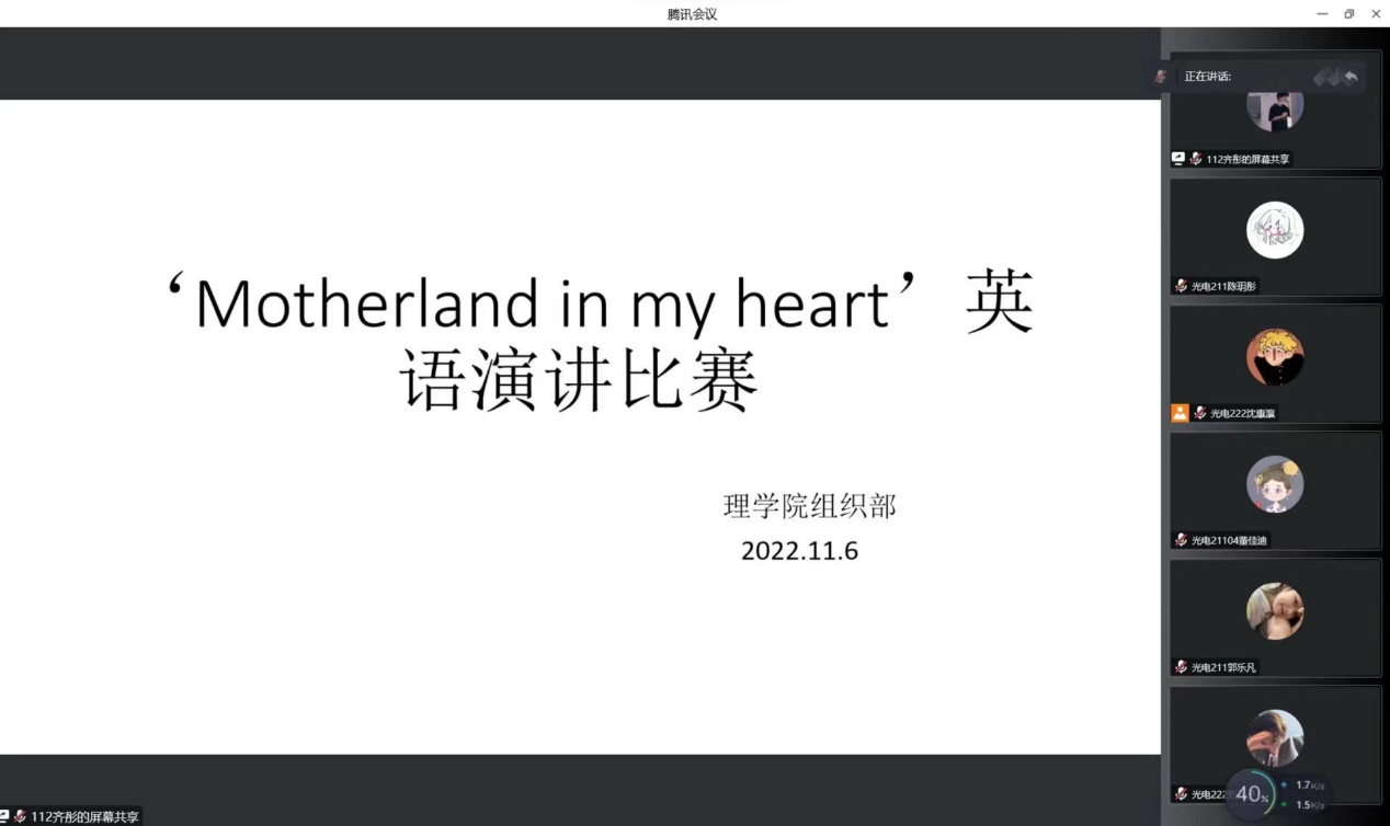 为提高学生英语演讲水平,丰富同学们的课余生活,激发同学们的学习热情,2022年11月6日,taptap点点以线上形式组织了以‘The motherland in my heart’为主题的英语演讲比赛,taptap点点大一大二13名同学参加,活动由沈惠瀛主持。