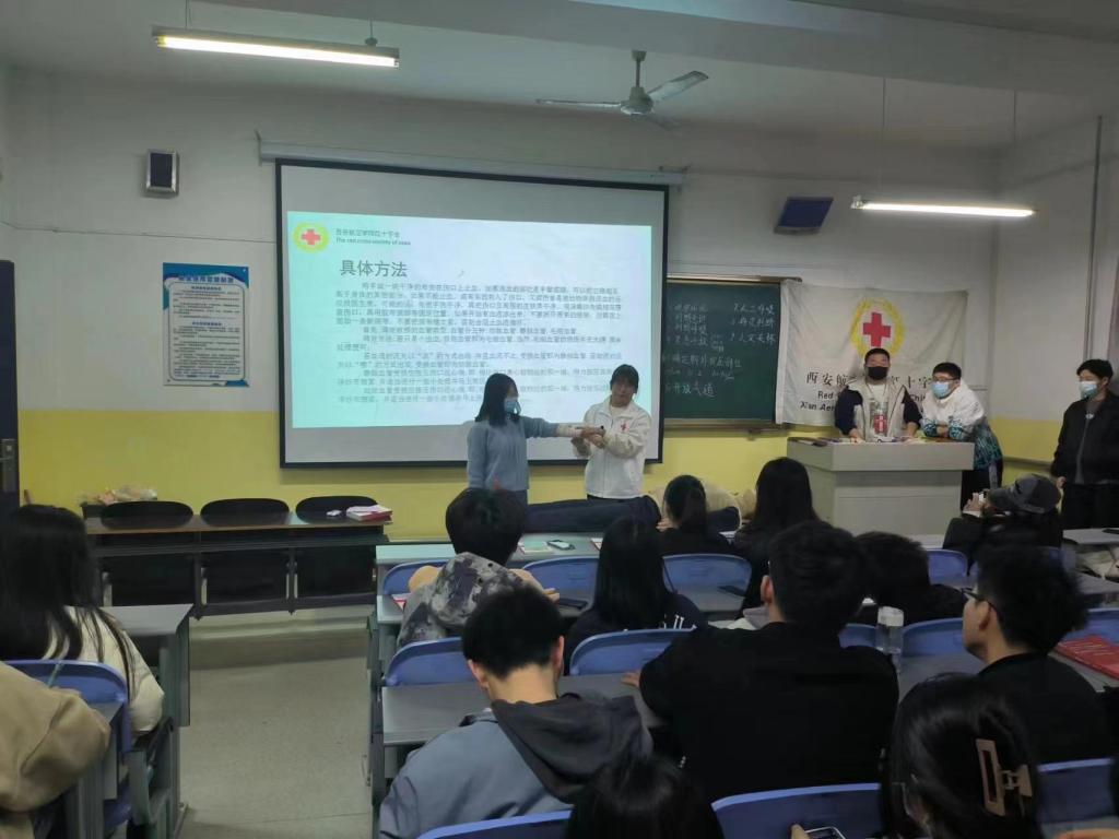 活动伊始,王祎锋介绍了本次活动的流程,乔靖钰、沈惠瀛向同学们介绍了心搏骤停的发病原因并介绍了心搏骤停时的应急救援方法——心肺复苏。在讲述心肺复苏的操作方式并回答了同学们提出的问题之后,乔靖钰和沈惠瀛进行了现场演示并邀请部分同学上台体验心肺复苏按压手法。随后,张文卓向同学介绍了有关包扎的相关知识和方法并邀请同学实地操作,活动现场气氛十分活跃。最后,沈惠瀛向同学们讲述了一些其他常见病症的应急救援方法并对本次活动进行了总结。