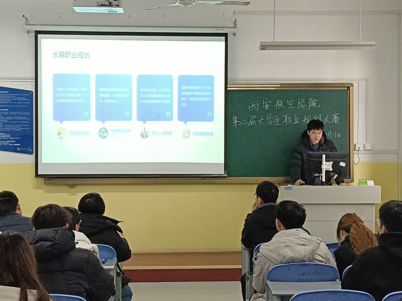 活动伊始,主持人详细介绍了第二届大学生职业规划大赛的赛程和要求,随后参赛选手用ppt向评委和观众展示了自己的职业生涯规划,评委针对选手的展示内容提出问题,考察了选手的心理素质,沟通能力以及逻辑思维能力,并就选手存在的问题给出修改建议,帮助选手完善比赛内容。