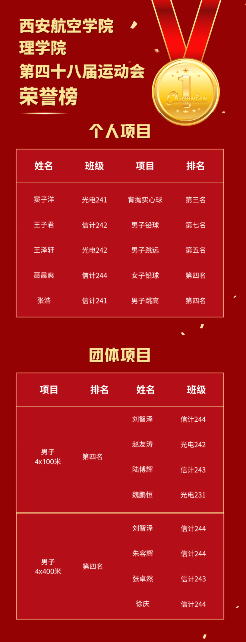4月18日下午,随着颁奖仪式的结束,西安航空学院第四十八届运动会圆满落下帷幕。历经两天的拼搏奋斗,在点点师生的共同努力下,学院荣获优秀组织奖、2024年度体育工作先进单位。理院学子在本次运动会个人和团体项目中表现出色,多名同学斩获佳绩,充分展现了理院学子的体育风采与拼搏精神。运动会的结束不是终点,而是新的起点。那些在赛场上迸发的激情、收获的友谊,都将成为前行路上的宝贵财富。