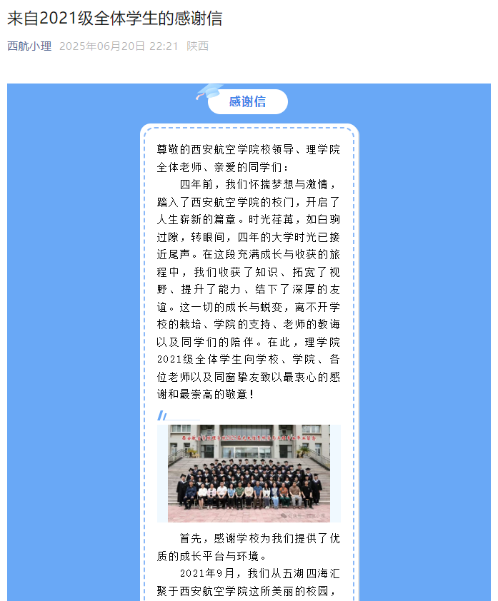 6月20日,2025届毕业生通过微信公众号发布感谢信,向学校、学院、老师和同学致以最衷心的感谢和最崇高的敬意,表示离开校园,将铭记母校精神,乘风破浪,披荆斩棘,在新的人生舞台上展示自己。