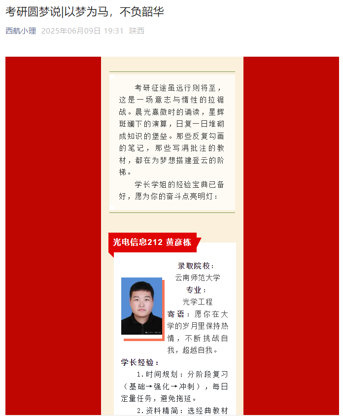 6月9日到6月25日,对考研成功学生、优秀毕业生进行宣传,凝练先进事迹和成功经验,利用学院宣传板和微信公众号展示优秀学子风采,发挥毕业生榜样引领力量,激励低年级学生奋发努力,严谨求学,推动学院优良学风的代际传承。