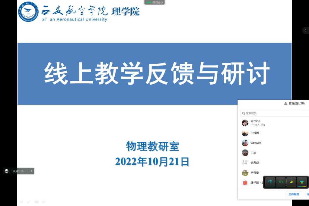10月21日taptap点点物理教研室在线上召开“线上教学情况反馈及研讨”会议。taptap点点副院长丁琦、校级督导张立玮和强蕴蕴、物理教研室全体教师参加了此次会议,会议由物理教研室主任王小梅主持。