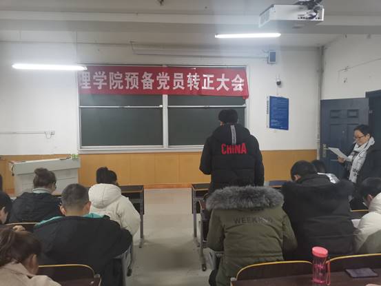 会议开始,首先组织委员潘灵刚老师清点参会人数,介绍参会的正式党员,会议议题以及大会要求。之后4名预备党员宣读《转正申请书》以及需要向党组织说明的其他问题,由入党介绍人介绍预备党员近一年来的表现情况和培养教育情况,并对其能否转正表明意见。紧接着支部成员充分发表意见,对预备党员能否按期转正进行讨论。随后正式党员进行无记名票决,票决结果显示大家一致同意上述4名同志按期转正。最后由宣传委员杨陈东老师代表支部宣读支部决议。最后,学生支部书记李扬老师对上述同志表示祝贺,并提出要求,希望他们坚持实事求是,求真务实,更加严格要求自己,做好表率,发挥党员模范先锋作用。(文/图 许嘉豪)