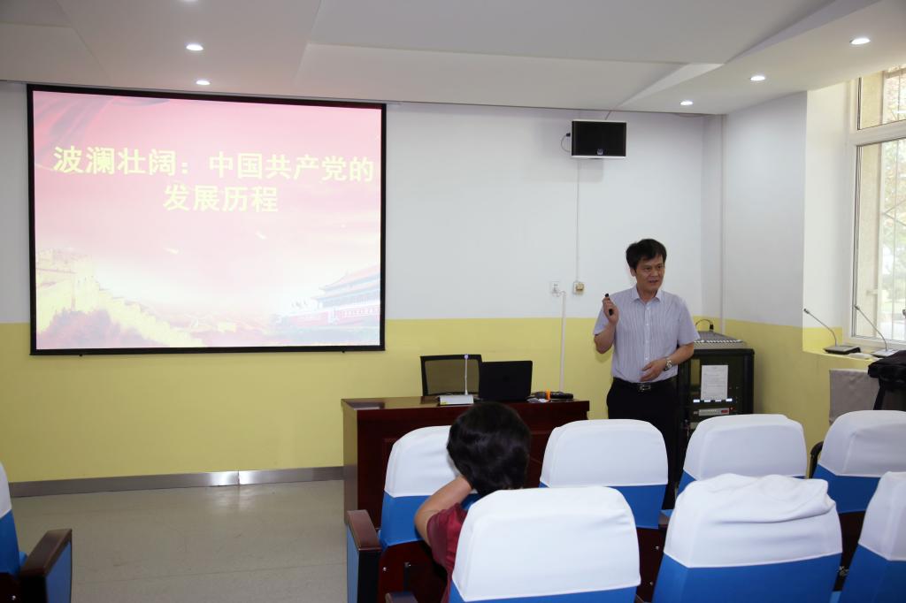 为了引导党员干部深入学习中国共产党波澜壮阔的历史,进一步坚定理想信念,扎实推进“两学一做”学习教育常态化制度化工作,2017年6月21日下午3:00,在沣惠校区南108报告厅taptap点点党总支书记岳忠玉为taptap点点、计算机学院全体教工党员和学生党员及部分入党积极分子讲了题为《波澜壮阔:中国共产党的发展历程》的党课。讲党课活动由计算机学院党总支书记刘晋云主持。