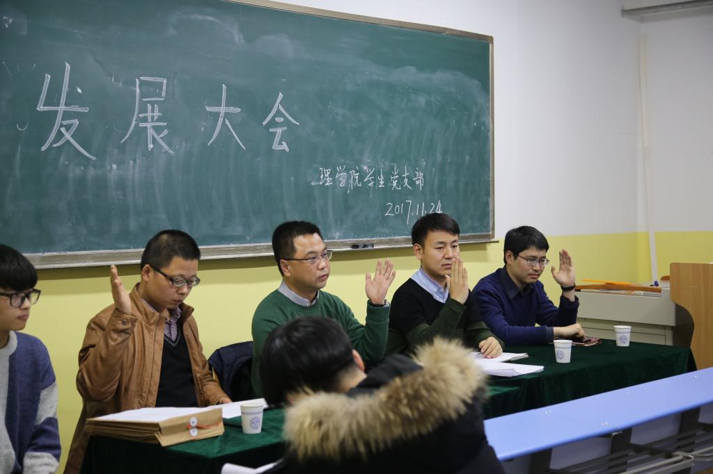 本次会议由正式党员曹建波老师主持,另外三名参与表决的正式党员是杨陈东老师,潘灵刚老师,邬华春老师。会议开始,首先由曹建波老师宣布开会,汇报出席会议的正式党员,会议议题以及大会要求。之后五名入党积极分子宣读《入党志愿书》以及需要向党组织说明的其他问题,由入党介绍人介绍发展对象的主要情况和对其进行培养教育情况,并对其能否入党表明意见。
