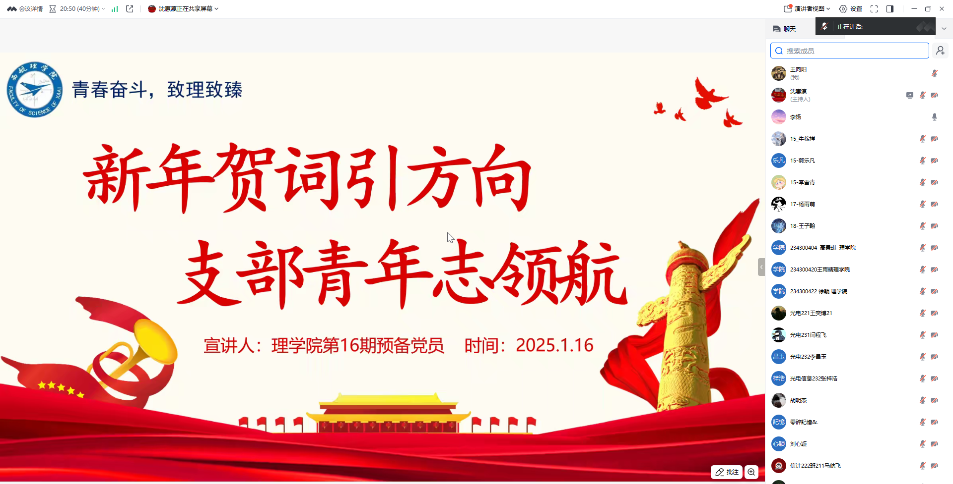 2025年1月16日taptap点点学生支部组织开展了以“新年贺词引方向,理院青年志领航”为主题的党日活动,学习习近平主席二〇二五年新年贺词,激励广大学生党员在新的一年里挺膺担当、奋发有为。支部全体党员参加,此次活动由组织委员王向阳老师主持。